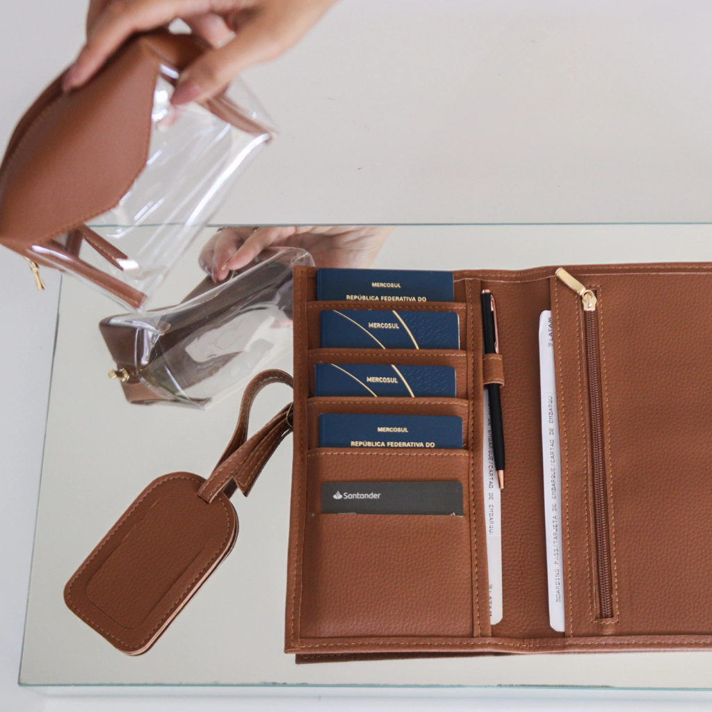O Porta Passaporte Slim protege seus documentos essenciais e facilita o acesso durante embarques e conexões, comportando até 4 passaportes. A Necessaire Cristal traz agilidade ao permitir visualizar seus itens rapidamente, evitando buscas desnecessárias. Já a Tag de Mala garante identificação fácil e segura, reduzindo o risco de extravios e trazendo mais confiança ao longo da viagem.