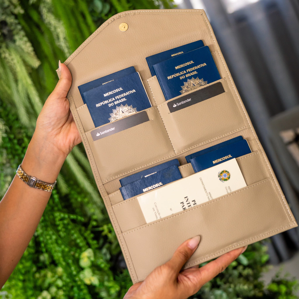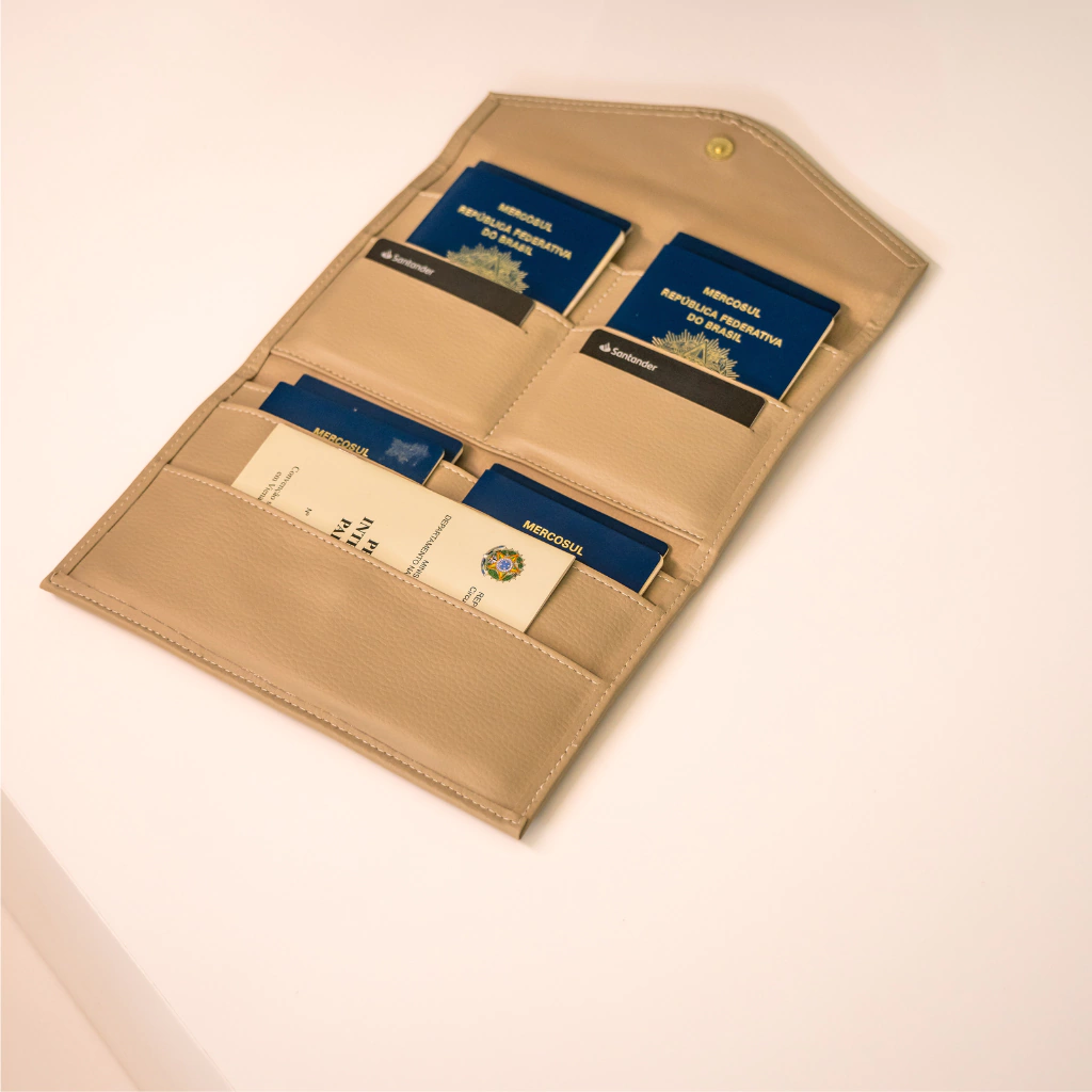 O Porta Passaporte Family foi projetado para atender às necessidades de toda a sua família durante a viagem. Com espaço suficiente para acomodar até 6 passaportes, ele é perfeito para garantir que todos os documentos de viagem estejam sempre à mão de maneira prática.